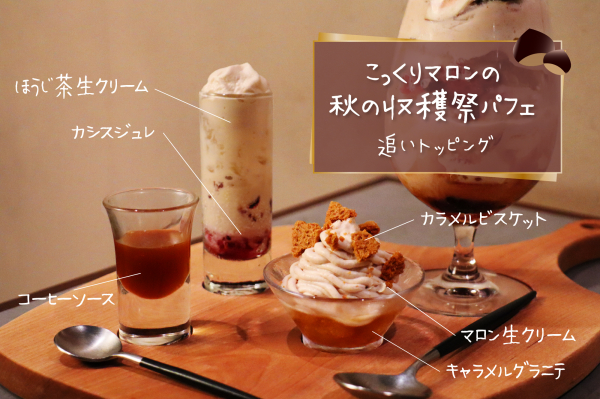 『こっくりマロンの秋の収穫祭パフェ』は単品2,300円、ドリンクとセットで3,000円(飲み比べ可能なお替りセットは+400円)です(全て税込)。発売期間は2024年10月10日(木)から11月下旬までの予定です。