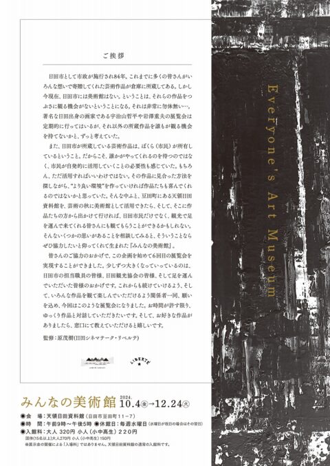 日田市として市政が施行され84年。これまでに多くの皆さんがいろんな想いで寄贈してくれた芸術作品が倉庫に所蔵してある。しかし今現在、日田市には美術館はない。ということは、それらの作品をつぶさに観る機会がないということである。それは非常に勿体無い…。著名な日田出身の画家である宇治山鉄平や岩澤重夫の展覧会は定期的に行ってはいるが、それ以外の所蔵作品を観る機会を持てないかと、ずっと考えていた。