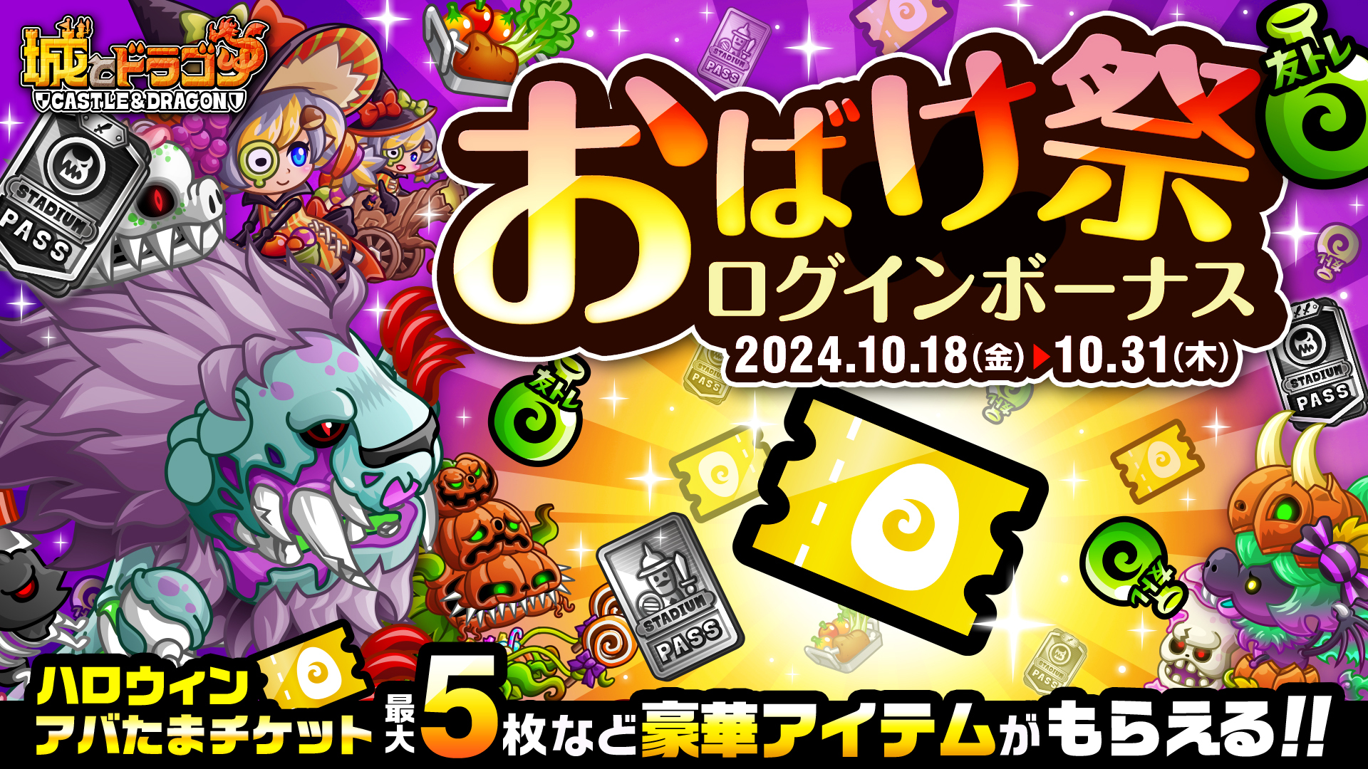 開催期間中、ゲームにログインすると「ハロウィンアバたまチケット」最大5枚など豪華アイテムがプレゼントされます。