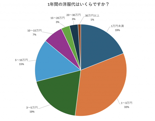 1年間の洋服代にかかる金額ついて、「1万円未満」が19%「1~3万円」が33%「3~5万円」が19%と、実に71%の人が1年間で服代にかかる金額を5万円以内に収めていることがわかりました。 「物持ちが良く購入頻度が低い」「節約のために出費を抑えている」などの意見が多く見受けられました。