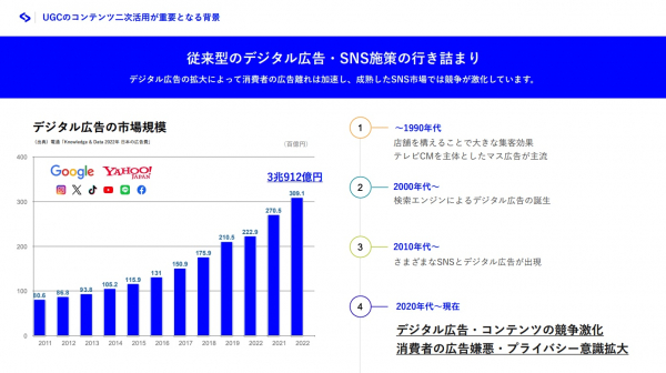 昨今、企業のマーケティング活動においてUGCの活用は注目を集めていますが、その一方で、実際の施策が効率的・効果的ではないために期待する効果が得られず、最終的にはUGCの活用そのものを中止するケースが散見されます。当社はこのような状況の根本的な原因として、UGCマーケティングに関する知識や実践的なノウハウが不足していることを認識し、本ホワイトペーパー作成のにいたりました。