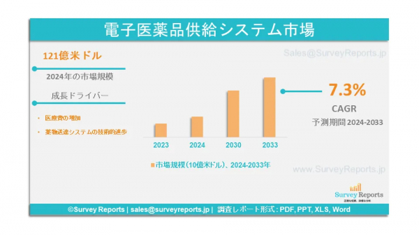 Surveyreportsの専門家は電子薬物送達システム市場の調査を分析し、2024年に電子薬物送達システム市場規模が121億米ドルに達すると予測した。さらに、電子薬物送達システム市場のシェアは、2033年末までに205億米ドルに達すると予測されている。電子薬物送達システム市場は、2024年から2033年の予測期間にわたって、年間平均成長率(CAGR)約7.3%で成長すると予測されている。