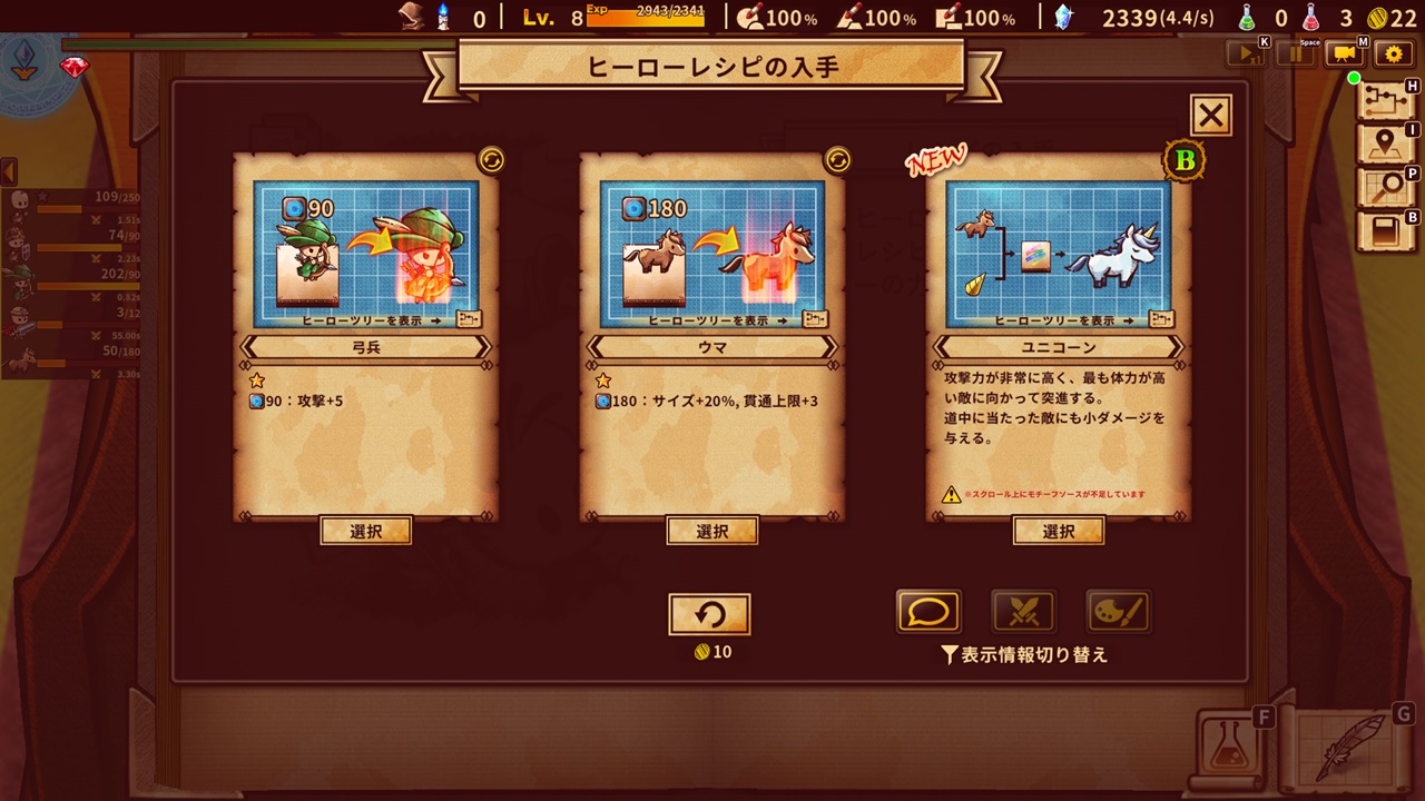 工場ビルドパートでは、遊ぶごとにランダムで生成されるスクロール上に、マナを消費しながら設備を整えていきます。素材が詰まっているコンベアに分配機をつなげて流れをスムーズにしたり、コンベアを交差させるためにブリッジコンベアを使ったり。設備の取り消しはマウスの右クリックで簡単に行え、消費したマナも返却されます。失敗を恐れずどんどん設置し、“ヒーロー”を量産!効率よくポータルへ運んで、バトルフィールドへ召喚しましょう。なお、制限時間内でのビルドが求められますが、時間の進行を遅くできる集中スキルや、完全に時間を止めてビルドに集中できる無制限モードもありますので、ぜひ活用してみましょう。