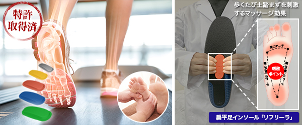 足全体の構造(足アーチ)に着目する事で、着用時の足への負担軽減だけでなく、歩行バランスの改善する扁平足インソール「リフリーラ」。