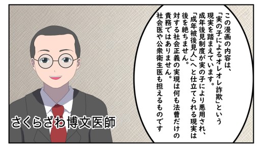 今回、値下げ販売とした『メンタル産業医解決 相続で涙を流す前に!!マンガで学ぶ公正証書遺言:~息子と嫁によるオレオレ詐んで欺編~ 予防争族シリーズ』は前述動画の電子書籍版です。値下げすることで、より多くの実子によるオレオレ詐欺という悲劇を未然に防ぐ啓発となり、「争族」を防止する支援となることを願ってやみません。