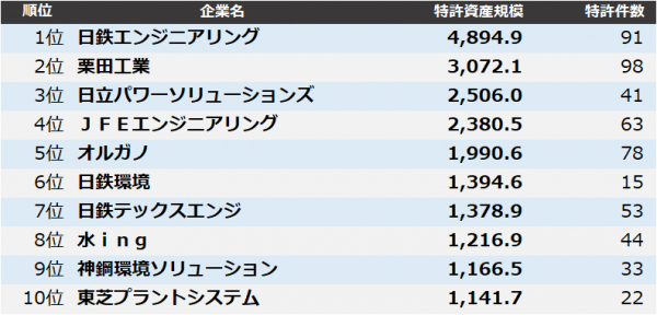 4位 JFEエンジニアリングは「排ガス中の酸性ガス濃度を予測し、その予測値に基づいて薬剤の供給量を制御する廃棄物焼却炉用の情報処理装置」、5位 オルガノは「電気再生式脱イオン装置とUV酸化装置を適切に組み合わせた、半導体製造用水の高度な全有機炭素(TOC)除去装置」が、注目度の高い特許として挙げられます。