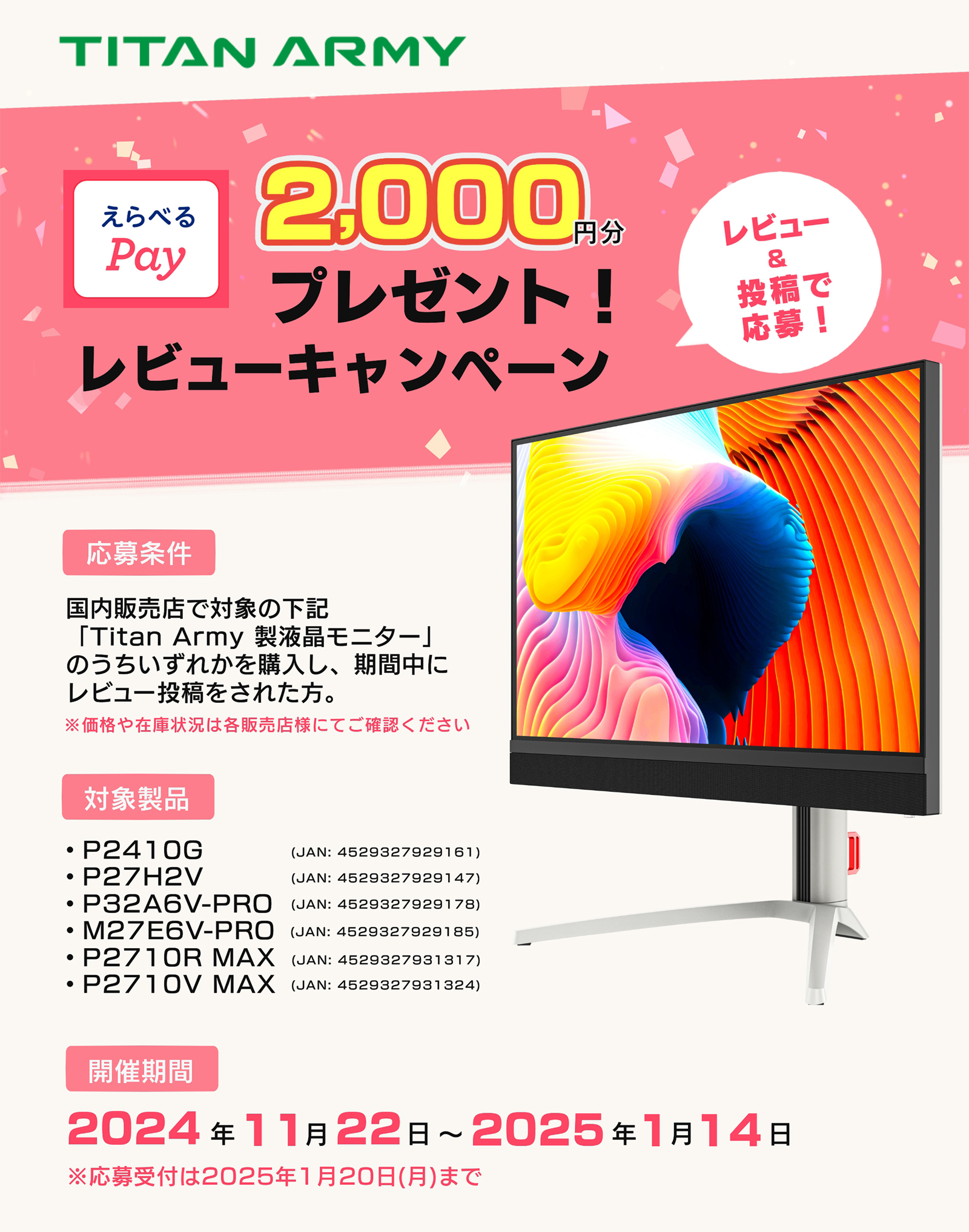 株式会社リンクスインターナショナル(本社:東京都千代田区、代表取締役:川島義之)は、好評発売中のTitan Army 製液晶モニター6製品のうちいずれかを購入し期間中にレビュー投稿をされた方へ、「えらべるPay(R)」 2,000円分をプレゼントするレビューキャンペーンを2024年11月22日(金)~2025年1月14日(火)まで開催いたします。※価格や在庫状況は各販売店様にてご確認ください。
