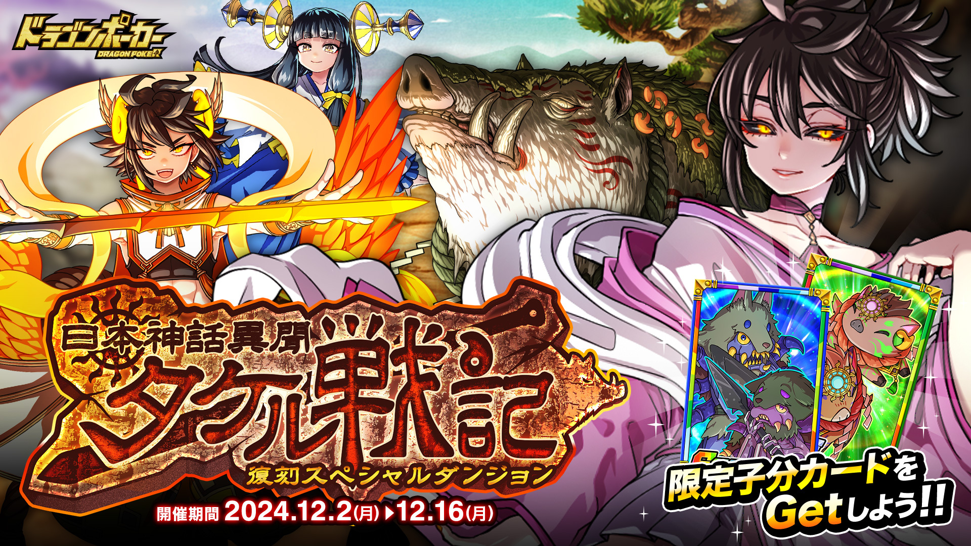 株式会社アソビズム(本社:東京都千代田区、代表取締役:大手智之)は、App Store・Google Playにて好評配信中のリアルタイム合体カードバトル『ドラゴンポーカー』で、2024年12月2日(月)より復刻スペシャルダンジョン「日本神話異聞タケル戦記」を開催いたします。