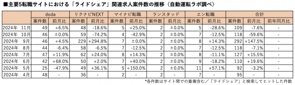主要転職5サイトにおけるライドシェアの関連求人案件数(※「ライドシェア」と検索してヒットした求人)は2024年11月末時点で前月比7.6%減の109件となりました。
