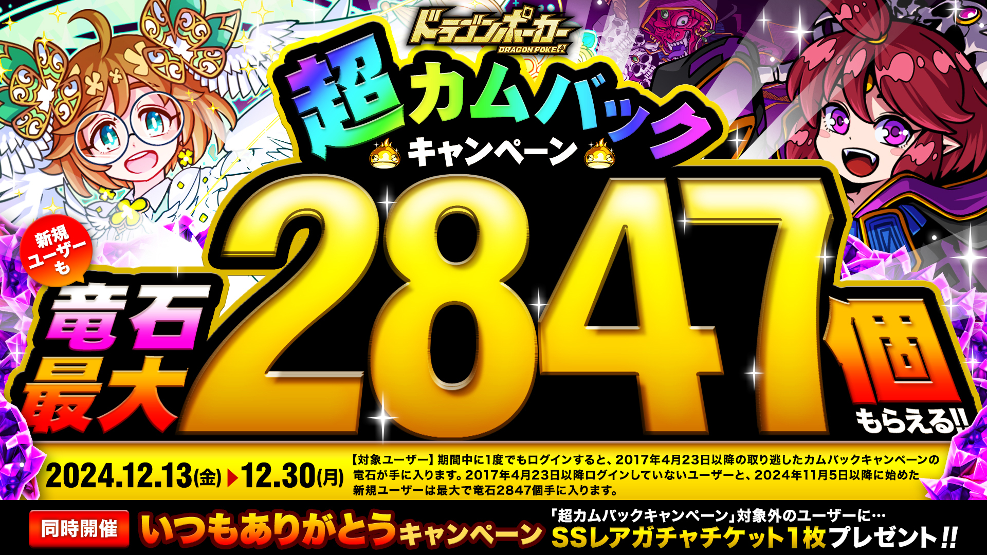 2017年4月23日以降に実施されたカムバックキャンペーンにて、ログインせずに受取れなかった竜石がまとめて手に入ります。2017年4月23日以降のカムバックキャンペーン期間中、ログインしていないユーザーに最大で竜石2847個をプレゼント!さらに、2024年11月5日以降にドラゴンポーカーを始めたユーザーにも竜石2847個プレゼント!これを機会に、ログインして大量の竜石をGETしましょう。また、いつも『ドラゴンポーカー』をプレイして頂いているユーザーの皆様には感謝を込めて、「SSレアガチャチケット1枚」をプレゼントいたします。