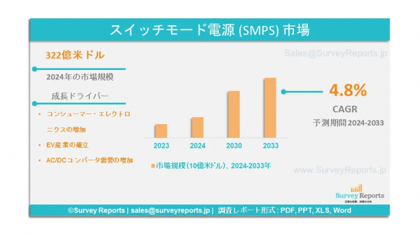 サーベイレポート合同会社は、スイッチモード電源(SMPS)市場の予測評価を提供する2024年12月発行の調査レポート「スイッチモード電源(SMPS)市場のタイプ別(AC→DC、DC→DC、DC→AC、AC→AC)、用途別(産業、民生用電子機器)セグメント - 世界の市場分析、動向、機会、予測、2024-2033年」を発表しました。スイッチモード電源(SMPS)市場の成長促進要因、市場機会、課題、脅威など、いくつかの主要な市場ダイナミクスを紹介しています。