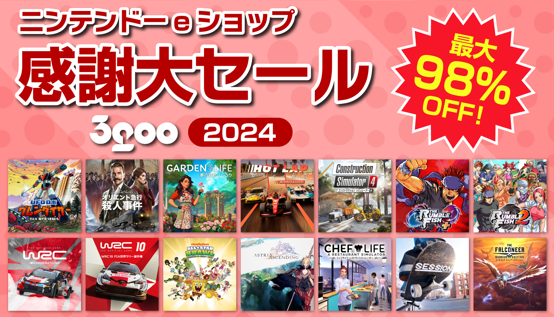 株式会社3goo(サングー)(本社:東京都渋谷区、代表取締役:ディコスタンゾ ニコラ)はニンテンドーeショップおよびPlaystation(TM)Storeにて、『アガサ・クリスティ オリエント急行殺人事件』『UFOロボ グレンダイザー:たとえ我が命つきるとも』を含む2024年に発売した新作や定番人気タイトルなど、ダウンロード版が最大98%引きとなる感謝大セールを期間限定で開催しております。