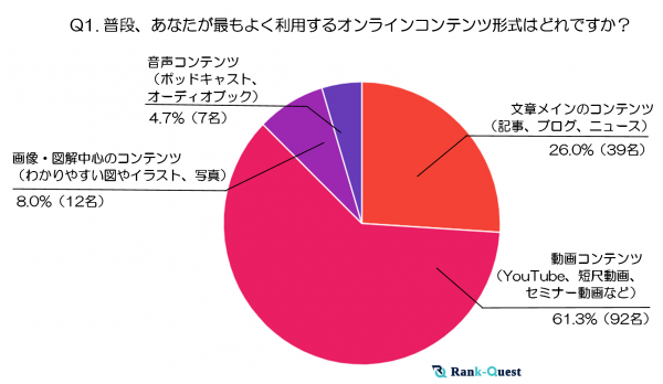 SEO支援で4,300社以上の実績を持つランクエスト(https://rank-quest.jp/column/column/how-to-seo/ )は今回、30代の男女150名を対象にアンケートを実施し、テキスト・動画・音声・画像・図解など、オンラインで入手できる様々なコンテンツの利用状況と場面ごとの好まれ方を調査しました。