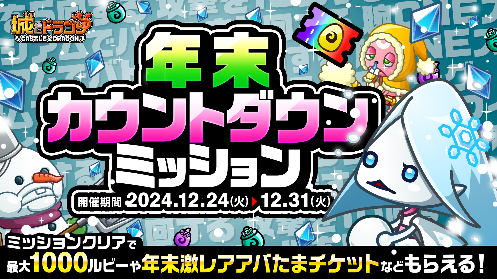 株式会社アソビズム(本社:東京都千代田区、代表取締役:大手智之)は、App Store・Google Playにて好評配信中の『城とドラゴン』で、「年末カウントダウンログインボーナス」と「年末カウントダウンミッション」を2024年12月24日(火)より開催いたします。