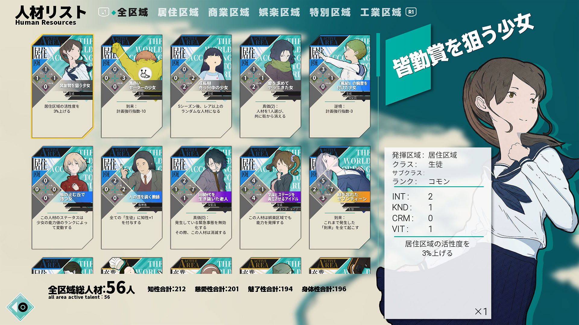 『世界の為の全ての少女』はデッキ構築型ローグライクと育成ゲームを合わせたアドベンチャーゲームで、「何者でも無い少女を世界の救世主にする」ゲームです。