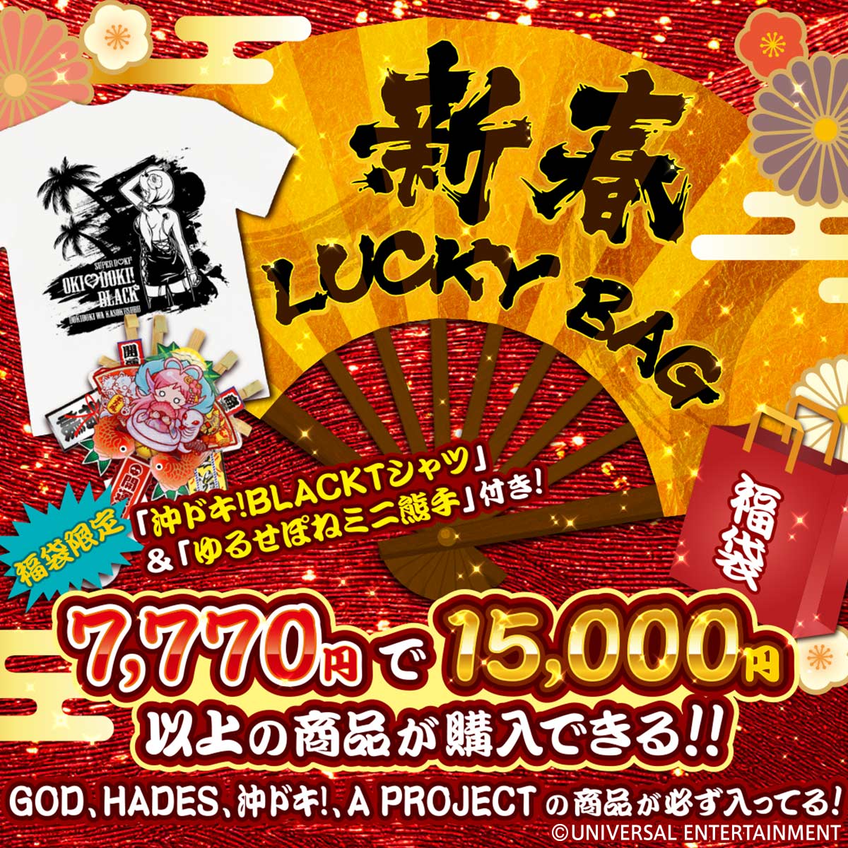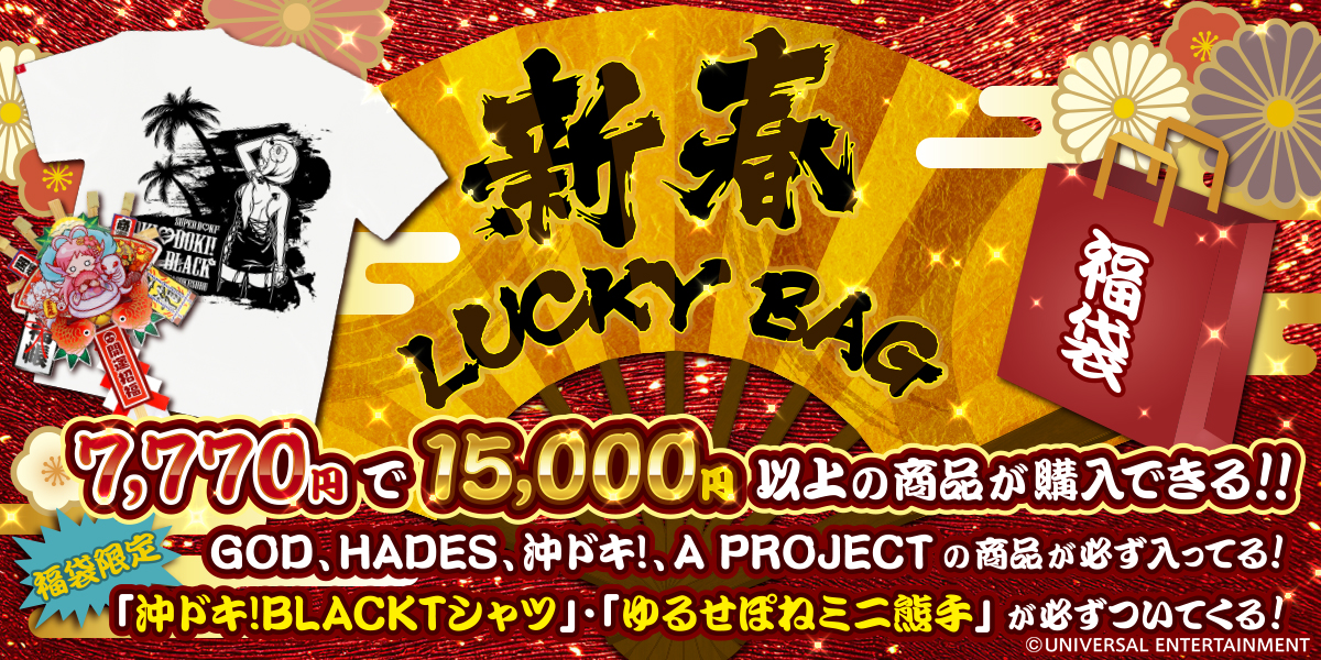 恒例の福袋限定グッズには「沖ドキ!BLACK Tシャツ」と、新年らしく「ゆるせぽねミニ熊手」をご用意しました!!