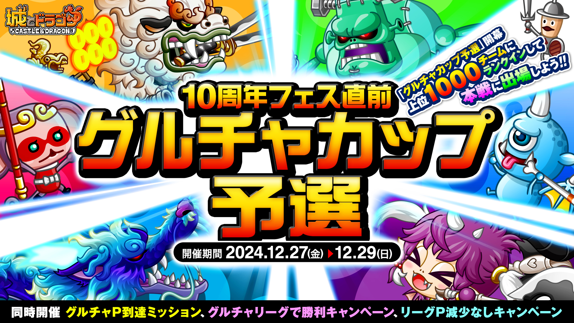 株式会社アソビズム(本社:東京都千代田区、代表取締役:大手智之)は、App Store・Google Playにて好評配信中の『城とドラゴン』で、「10周年フェス直前 グルチャカップ予選」を2024年12月27日(金)より開催いたします。