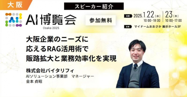 生成AIを活用したSaaSサービスの提供を行う株式会社バイタリフィ(東京都渋谷区、代表取締役:板羽晃司)は、2025年1月22日(水)~1月23日(木)にマイドーム大阪で開催される「AI博覧会 Osaka 2025」に出展いたします。