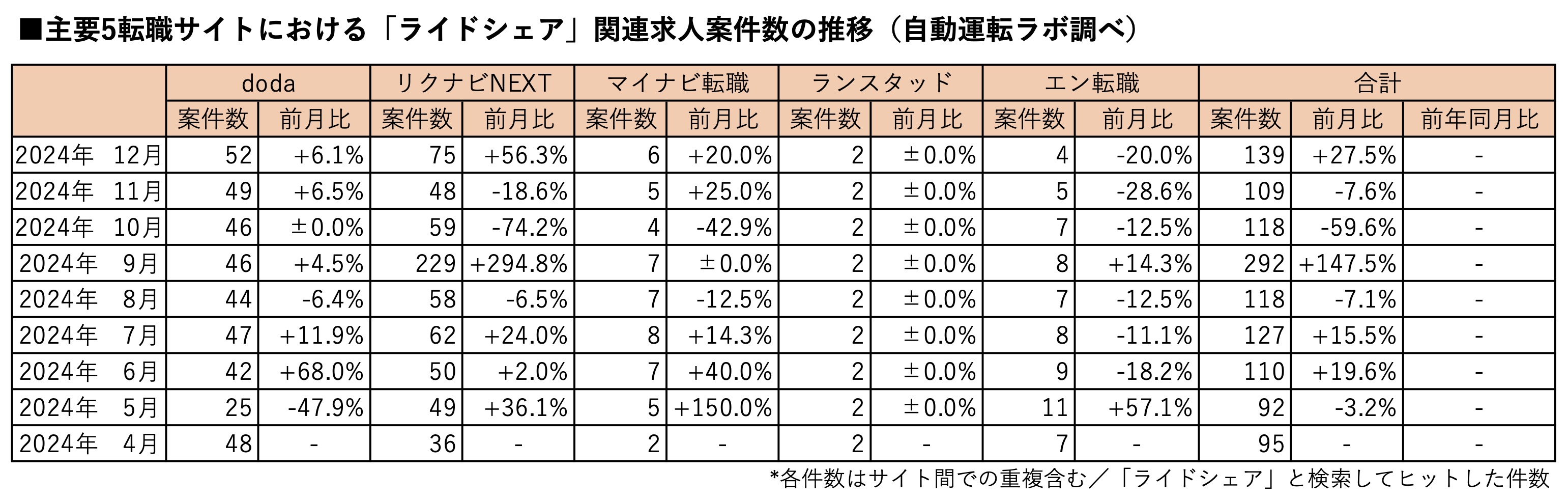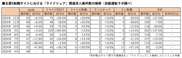 主要転職5サイトにおけるライドシェアの関連求人案件数(※「ライドシェア」と検索してヒットした求人)は2024年12月末時点で前月比27.5%増の139件となりました。