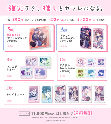 株式会社インクルーズ(東京都渋谷区、代表取締役社長 山﨑 健司)が企画・運営するフィジカルグッズのオンラインくじ「カワセルくじ 乙女部」にて、1月22日(水)より、「強火ヲタ、推しとセフレになる。」のくじが発売開始になりましたことをご報告させていただきます。