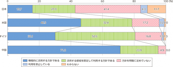 昨今、国内およびグローバル市場において、AI技術の進化と普及が加速度的に進む中、日本企業のAI活用は国際的に見て後れを取っている状況です。総務省の調査によると、日本で“活用する方針を定めている”(「積極的に活用する方針である」「活用する領域を限定して利用する方針である」の合計)と回答した割合は42.7%、半数以上の企業においては実装段階に至っていないようです。