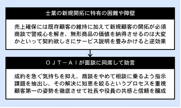 OJT-AIは成約を急ぐ気持ちを抑え、商談をやめて相談に乗ることで社長や役員の共感と信頼を育めるように導きます。