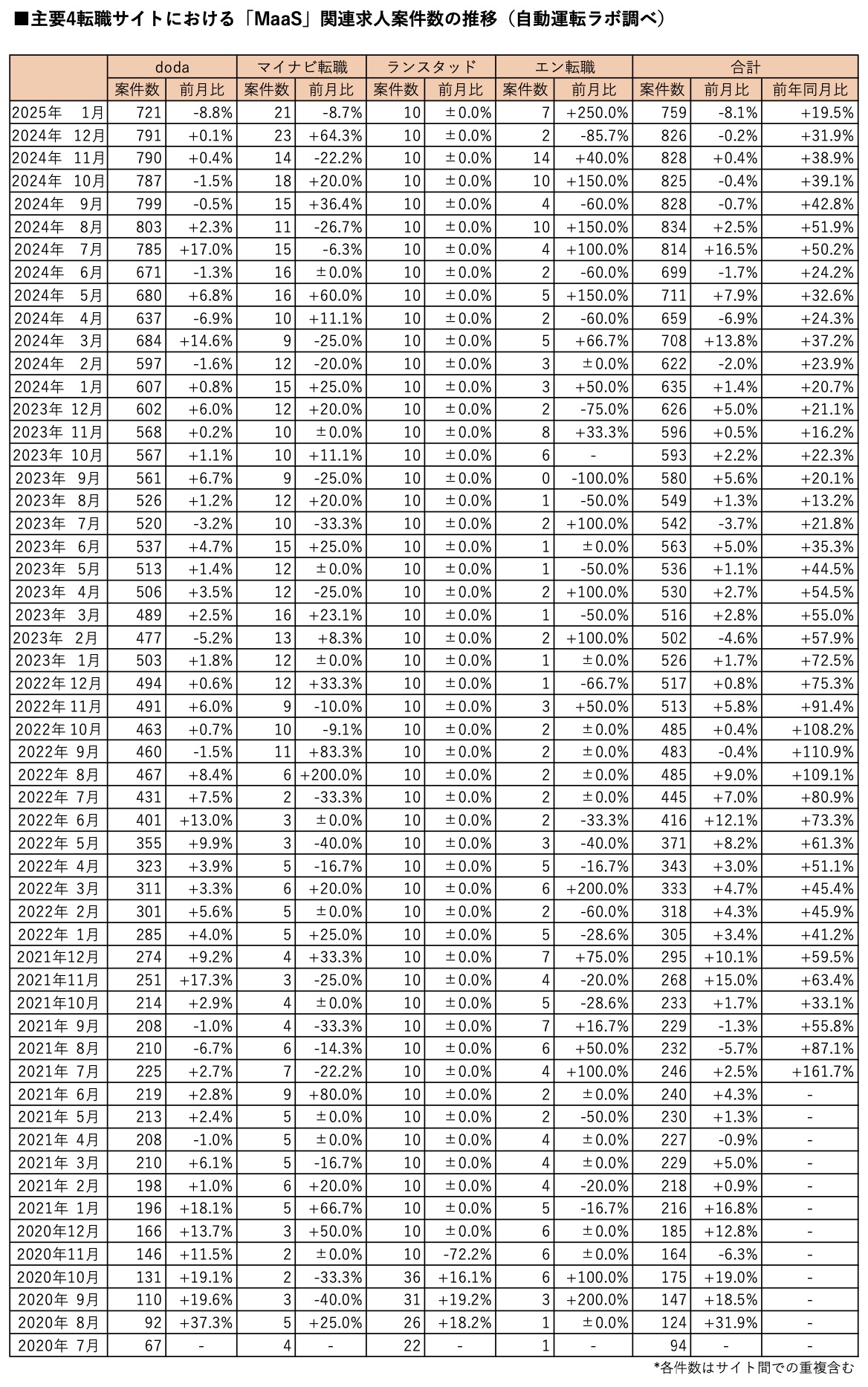 「MaaS」の関連求人案件数(主要転職4サイト)は2025年1月末時点で、前月比8.1%減、前年同月比19.5%増の759件となりました。