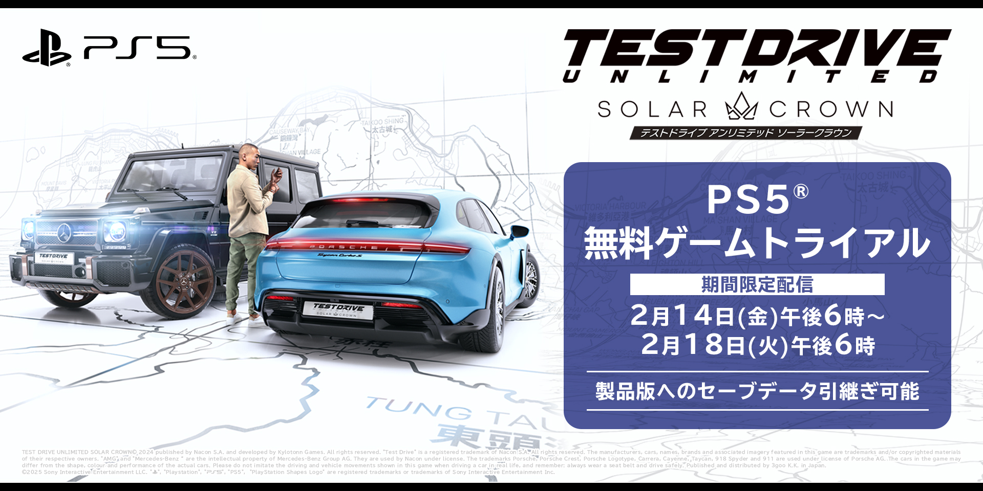 株式会社 3goo(サングー)(本社:東京都渋谷区、代表取締役:ディコスタンゾ ニコラ)は、PlayStationTMStore にて、香港島を舞台にしたオープンワールドレーシングゲーム 『テストドライブ アンリミテッド ソーラークラウン』の無料ゲームトライアルを、2025 年 2 月 14日(金)午後 6 時から 2 月 18 日(火)午後 6 時の期間限定で配信することを発表いたしました。