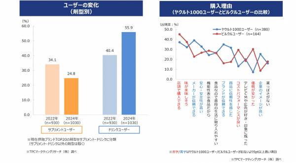◆商品面では、前回調査に引き続き「ヤクルト1000/Y1000」が市場を牽引しているなか、今回調査では「ピルクル ミラクルケア」「おいしい免疫ケア 睡眠」などの近年発売されたドリンクタイプを中心とした商品の摂取率が上位に多く挙がっている。また、前回調査時からのユーザーの変化を剤型別にみると、サプリメントユーザーは9.3pt減少している一方、ドリンクユーザーは15.5pt増加しており、ユーザー像の変化がうかがえた。具体的に、睡眠の悩みが軽度で、ドリンクタイプなどで手軽に改善したい「手軽タイプ」が新たに登場している。