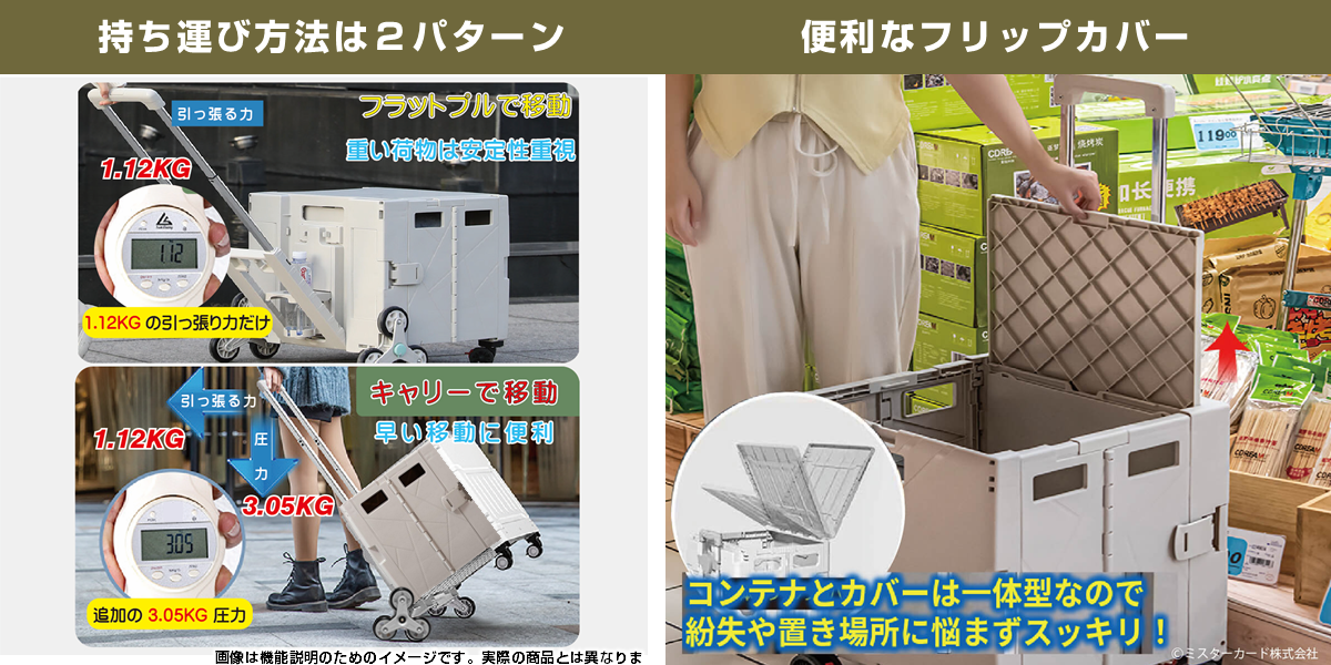 【持ち運び】 重い荷物はフラットプル移動、階段や段差はキャリー移動の2パターン。