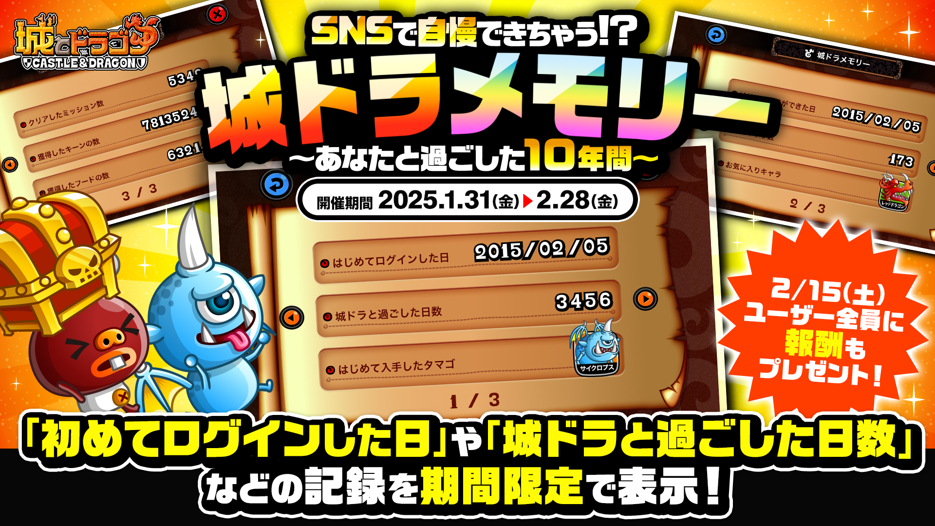 「初めてログインした日」や「城ドラと過ごした日数」など、2025年1月31日(金)までのユーザーの記録をゲーム内に期間限定で表示します。スクショしてSNSでシェアすることも!また2月15日(土)より、過ごした日数などに応じたルビーをユーザー全員にプレゼント中です。期間中の受け取りをお忘れなく!