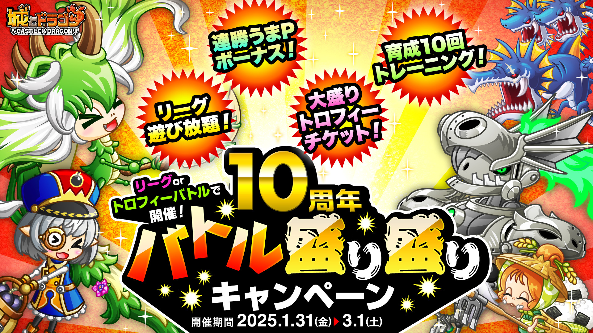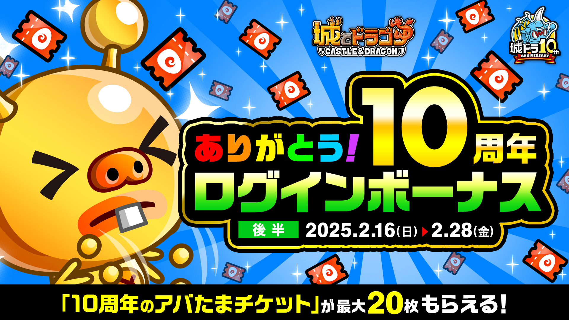 現在開催中の『城とドラゴン』10周年記念キャンペーン「ありがとう10周年!城ドラ超感謝祭」の“後半”が、2月16日(日)より開催中です。前半に引き続き特別なログインボーナスやミッションはもちろん、1日1回最大“10,100ルビー”が当たる!?「10周年ルビーアバたま」も実施!さらに新たなキャンペーンとして「新生!トロフィーバトル」や、新たな機能「祝福」を使ったキャンペーンも実施いたします。後半も『城とドラゴン』のお祭りをぜひお楽しみください!