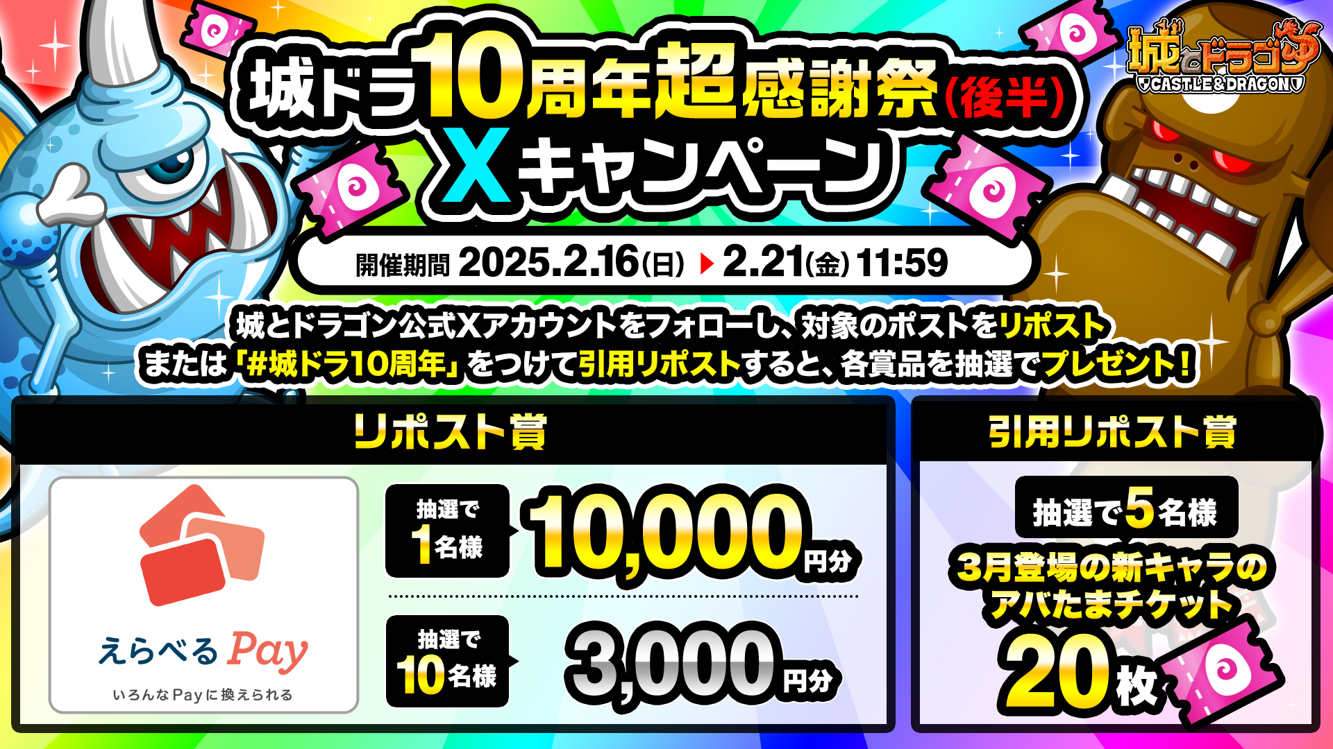 2月16日(日)より「城ドラ10周年超感謝祭(後半)Xキャンペーン!」が開催中です。『城とドラゴン』公式Xアカウント(@shirotodoragon)をフォローし、対象ポストをリポストまたは「#城ドラ10周年」をつけて引用リポストしていただいた方の中から抽選で、各賞に応じて「えらべるPay(R)」や、ゲーム内で3月の新キャラなどがラインナップされたアバたまに挑戦できる「アバたまチケット」をプレゼント!