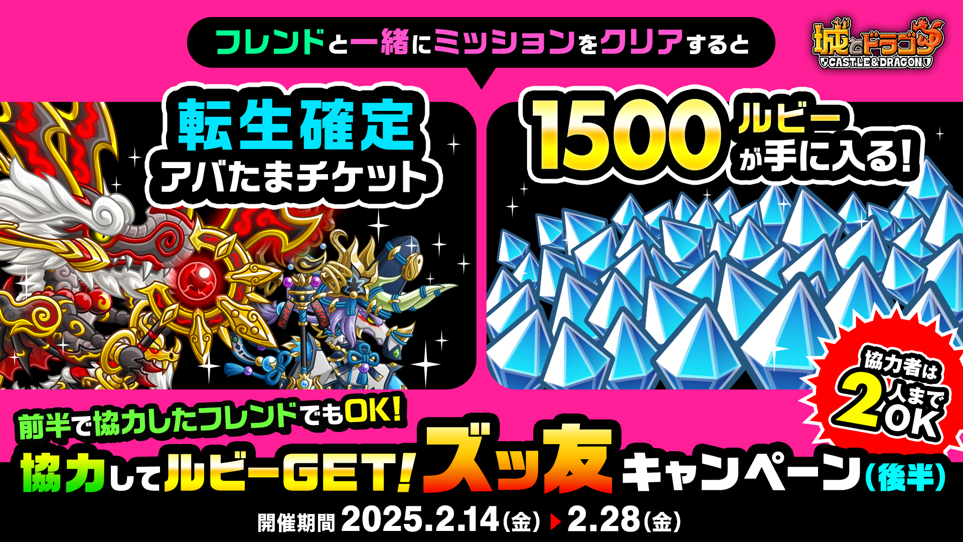 期間中、条件を満たした仲間と協力してミッションをクリアすると、「転生確定アバたまチケット」や最大1500ルビーが獲得できます。協力者は2人までOKとなっています。
