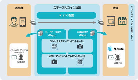 ブロックチェーン技術を活用し、店舗は消費者から直接ステーブルコインを受取可能。店舗はスマートフォンやタブレットがあれば専用の決済端末は不要であり、導入にあたっては、暗号資産交換所等への口座開設からアプリケーション導入までをサポート予定。
