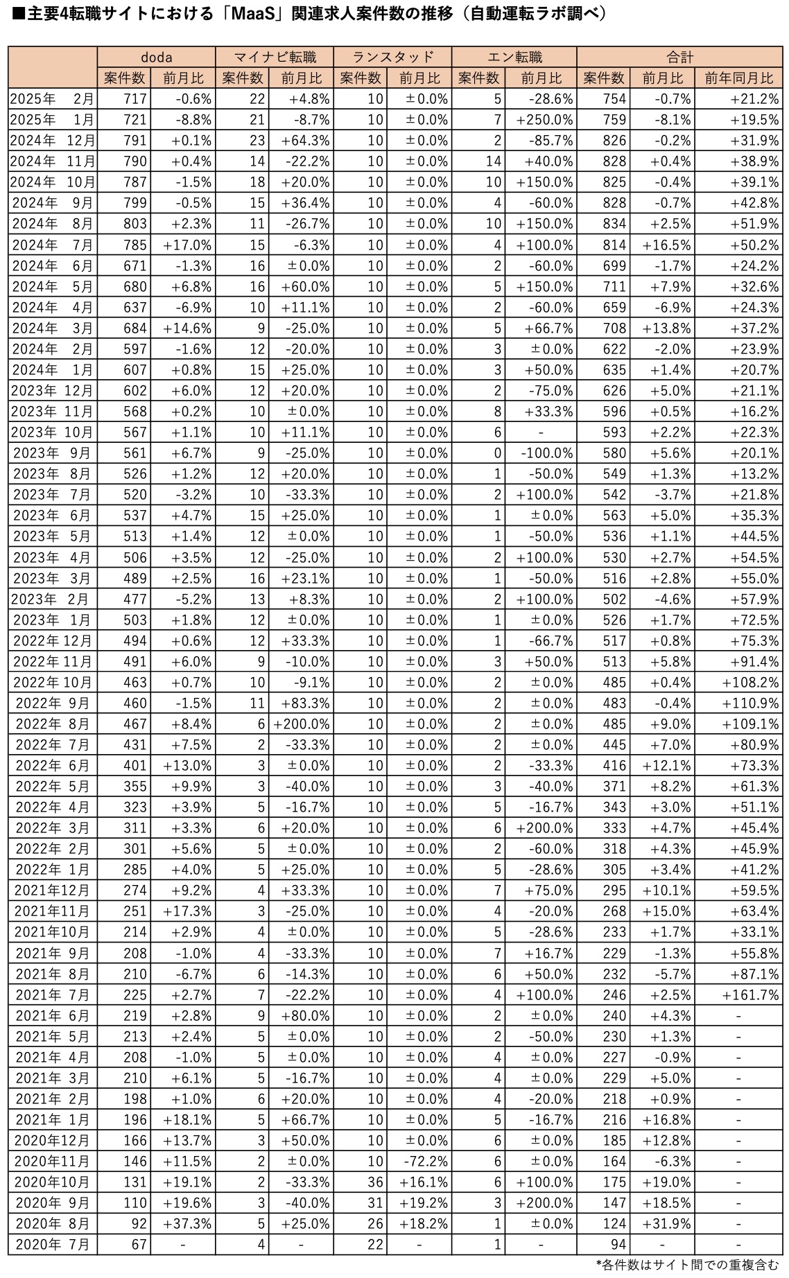 「MaaS」の関連求人案件数(主要転職4サイト)は2025年2月末時点で、前月比0.7%減、前年同月比21.2%増の754件となりました。