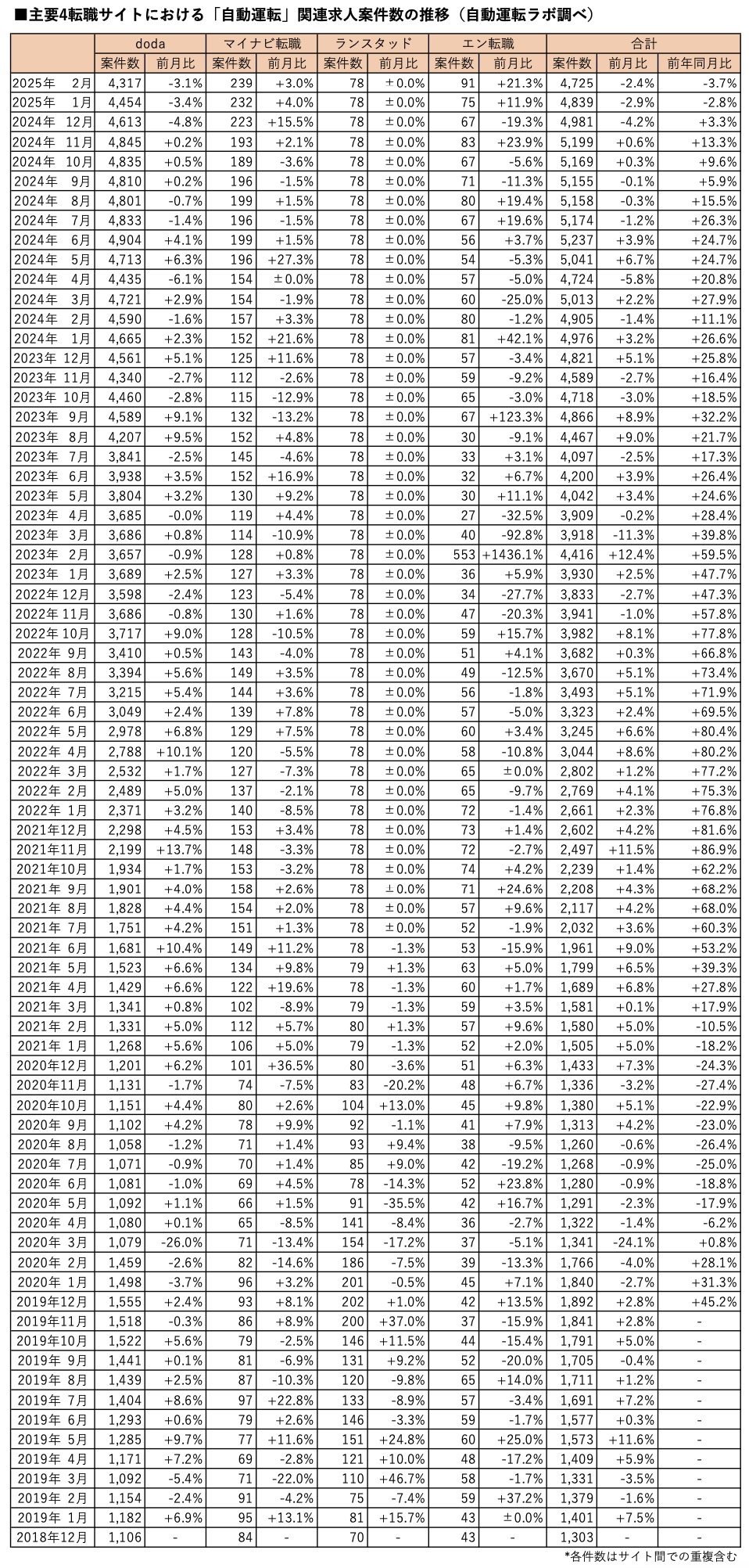 「自動運転」の関連求人案件数(主要転職4サイト)は2025年2月末時点で、前月比2.4%減、前年同月比3.7%減の4,725件となりました。