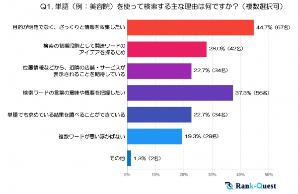 https://rank-quest.jp/column/column/how-to-seo/ 【SEO対策】で検索順位No1を獲得したランクエスト(注1)40代「単語vs複数ワード検索」の実態を調査