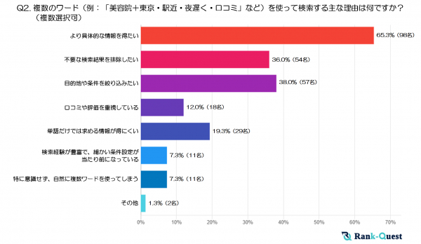 最も多かった回答は「より具体的な情報を得たい」(65.3%)でした。単語検索だけでは十分に把握できない詳細情報を求める際に、複数ワードによる検索が重宝されていると考えられます。