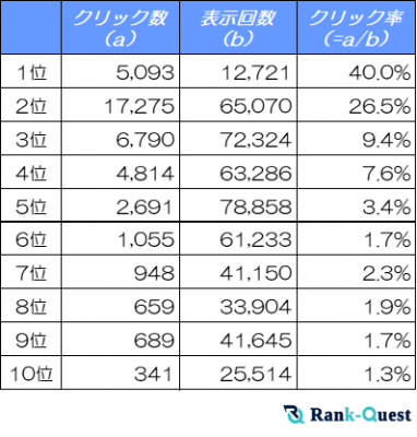 ・特に6位以下になると3%台を大きく割り込み2%前後です。これは上位枠以外に表示されるとユーザーの目に止まりにくくなるためと推測できます。
