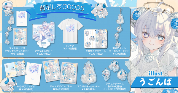イラストレーター『うごんば』さん書きおろしのイラストを使用したアクリルキーホルダーやクリアファイル、『詩羽しう』さん書きおろしのイラストを使用したTシャツなど、計9種のオリジナルグッズは、2025年4月21日(月)までの期間限定で販売しております。