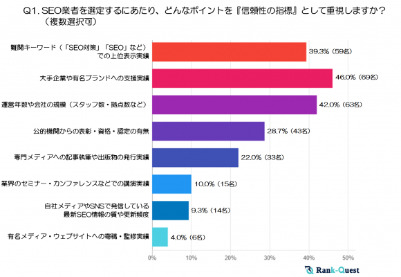 最も多かった回答は「大手企業や有名ブランドへの支援実績」(46%)でした。次いで「運営年数や会社の規模」(42%)、「難関キーワード(『SEO対策』・『SEO』など)での上位表示実績」(39.3%)が続いています。
