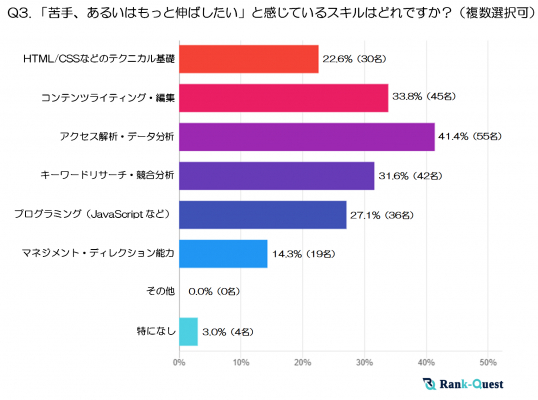 最も多かった回答は「アクセス解析・データ分析」(41.4%)でした。SEOの効果測定や改善にはデータの把握と分析が欠かせないため、苦手意識がある一方で「もっと強化したい」と感じている人が多いようです。