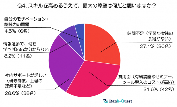 最も多かった回答は「費用面(有料講座やセミナー、ツール導入のコストが高い)」で、全体の31.6%(42名)にのぼりました。スキルアップに直結する学習コンテンツやツールは魅力的ですが、受講料や導入費用がネックになっている人が多いようです。