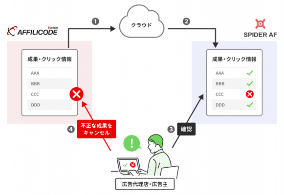 広告代理店・広告主企業にシステム提供を行うアフィリコード・システムでも、この問題を深刻に捉え対策を強化。不正検知システムのリーディングカンパニーとして、豊富なデータと高度な分析技術をもつSpider AFとの間でパートナーシップを締結しました。
