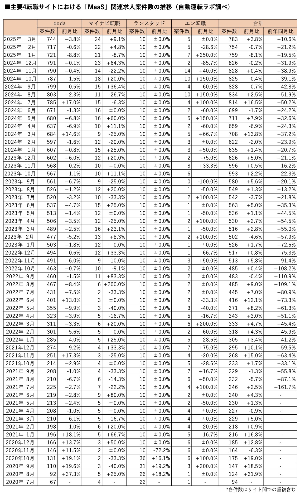 「MaaS」の関連求人案件数(主要転職4サイト)は2025年3月末時点で、前月比3.8%増、前年同月比10.6%増の783件となりました。