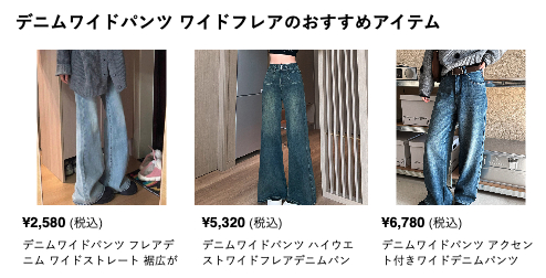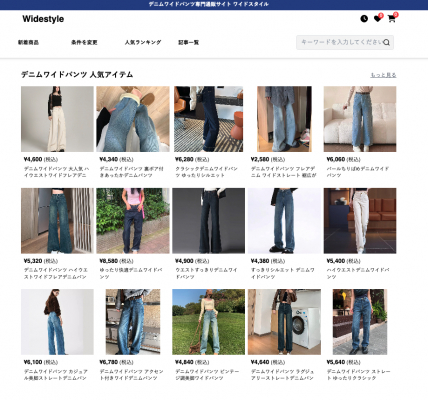 総合通販サイトでは見つけにくい自分にぴったりのデニムワイドパンツを、「ワイドスタイル」ならスムーズに見つけることができます。