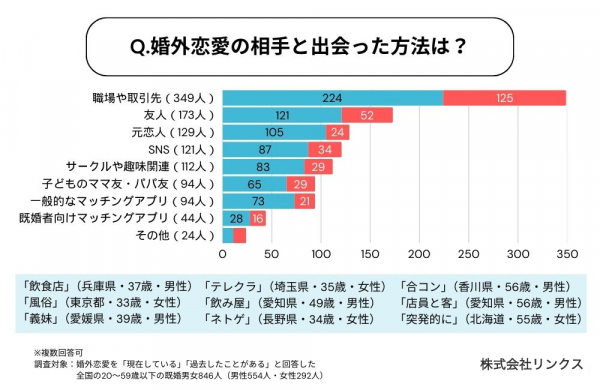 婚外恋愛の相手とどこで出会ったかを尋ねたところ、最多は「職場や取引先」。