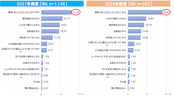 また、「上の子で購入したから」という回答は2021年の18.81%から2025年には18.84%とほぼ横ばいであり、一定数の家庭が同一のチャイルドシートを複数の子どもに使用していることが分かった。