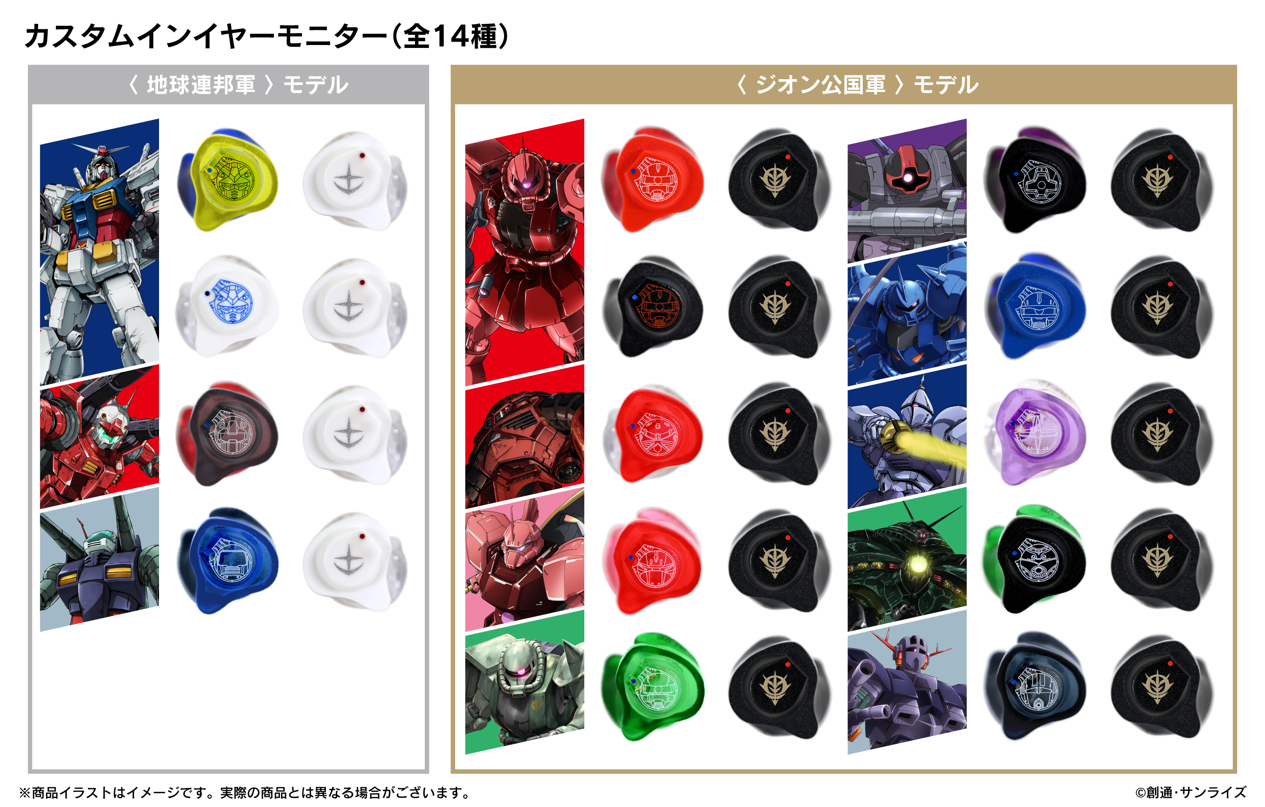 本コラボレーションモデルは、地球連邦軍「ガンダム(2タイプ)」「ガンキャノン」「ガンタンク」、ジオン公国軍「シャア専用ザク(2タイプ)」「シャア専用ズゴック」「シャア専用ゲルググ」「ザクII」「ドム」「グフ」「ギャン」「ビグ・ザム」「ジオング」の全14モデルをラインナップ。地球連邦軍、ジオン公国軍共に右側は統一、左側は選択式(地球連邦軍は4種、ジオン公国軍は10種)となります。ケーブルはFitEar cable 004(IE-K1用)、FitEar cable 012(IE-K2&IE-K3用)、ケーブルクリップ、クリーニングブラシを付属。Universal(セミカスタム)モデルのイヤーチップはAZLA SednaEarfit SE1500(SS,S、MS,M,ML,Lの6サイズ)。地球連邦軍モデルは地球連邦軍マルチケース&BOXパッケージにセット、ジオン公国軍モデルはジオン公国軍マルチケース&BOXパッケージにセットとなります。また、ビッグアクリルイヤモニスタンド(全12種)を販売、K3 Custom IE-K3モデルには、「3年保証付」「ペリカン1010ケース」「ビッグアクリルイヤモニスタンド」を付属致します。尚、「春のヘッドフォン祭2025」に須山歯研と共同で展示・試聴、耳型採取が可能なブースを出展致します。